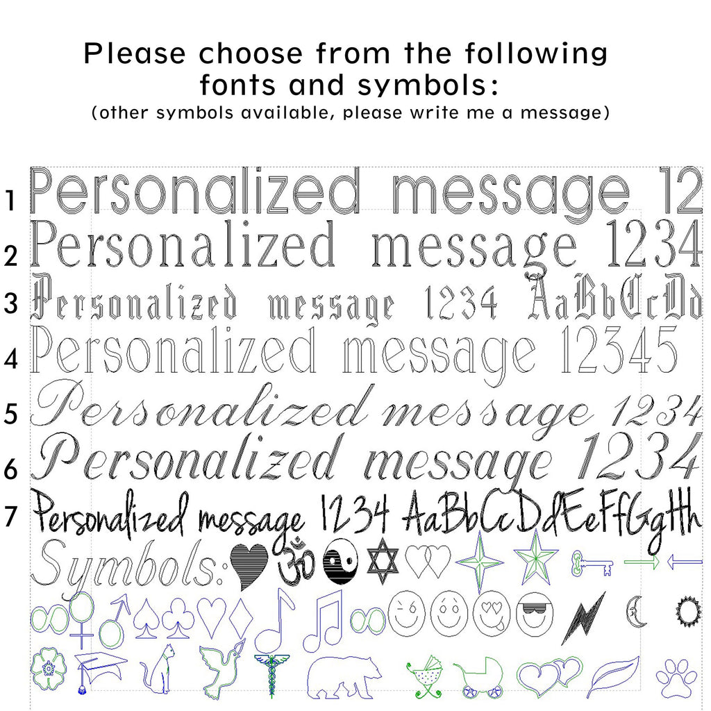 Write your the name or date you want engraved and your preferred font in "Special instructions for seller" during checkout! If you do not mention a custom message, I will send it blank.